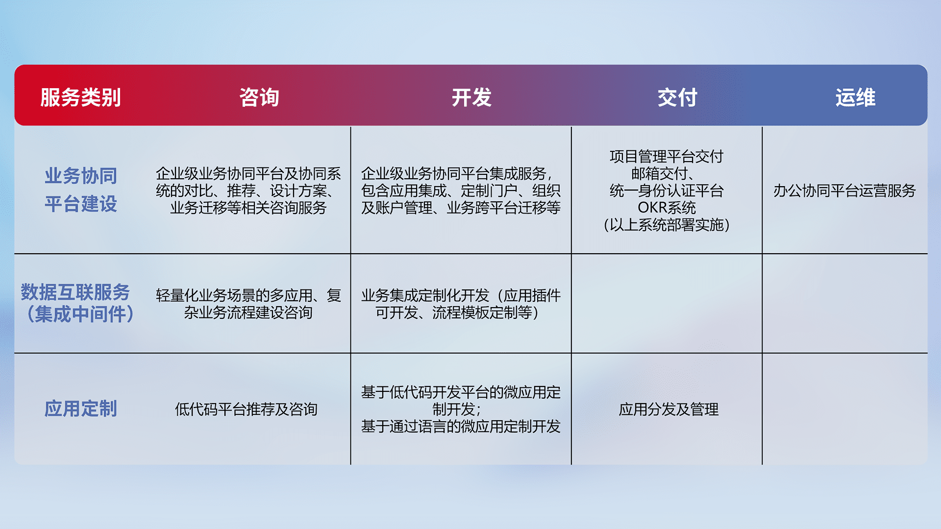 针对钉钉、、、、企微、、、、IDaas等平台级产品提供产品的规划、、、方案、、交付、、定制化开发等服务,,,,实现如统一协同办公、、、智能客户服务、、、混合会议管理、、智能数据查询、、等业务场景,,实现数字化转型。。。。